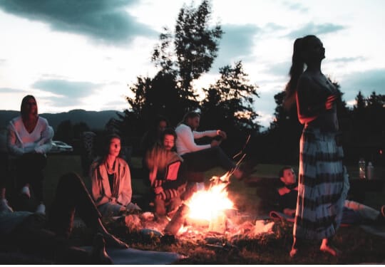 Večerni krog ob ognju, kjer se dan počasi zapre